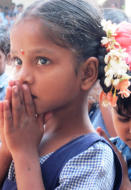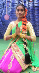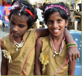 Bild rechts eine Lehrerin bei einem indischen Begrüßungstanz.