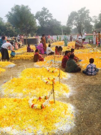 Als wir das Friedhofsgelände betreten, habe ich das Gefühl, dass ich das Fest nie wieder mit dem Wort „gruselig“ in Verbindung bringen werde: Jedes Grab ist mit weißem Pulver und anschließend mit so vielen leuchtend gelben Blütenblättern überschüttet worden, dass man das Pulver wiederrum nur erahnen kann und der ganze Friedhof wie ein riesiges Blumenmeer wirkt.