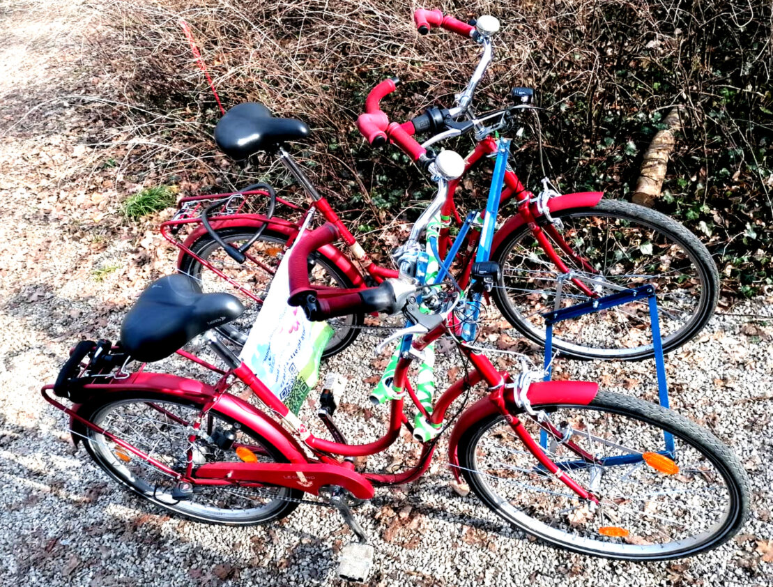 Man verwende zwei baugleiche Damenräder mit Stahlrahmen. Dies ist wichtig, denn die Kreuzverstrebungen benötigen ein Doppelrohr, daher Damenrad. Aluminium wiederum wäre zu wenig elastisch, es neigt stattdessen zu Spontanbrüchen, ebenfalls Kohlefaser ist hier ein no-go. Der Abstand zwischen beiden Rädern (mittig vom Gestänge gerechnet) beträgt 66,5 cm. Somit liegt man mit dem äußeren der Pedalen beider Räder noch unter einem Meter. Ein Meter breit sind i.d.R. die Absperrungen zu Fahrradbereichen, diese können also gut passiert werden.