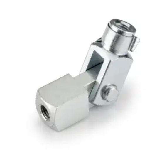 Zwei solcher Gabelgelenke (Innengewinde M8) werden benötigt, sie verbinden die beiden Räder durch die Sattelstützenschraubenlöcher. In diese eingeschraubt M8-Edelstahl-Gewindestangen. Diese wiederum gegen zu starkes Verbiegen mit Edelstahlstangen (Innendurchmesser 8 mm) geschützt. In der Mitte, wie unten zu sehen ist, sind zwei Kontermuttern, diese sind nicht zwingend erforderlich, sind aber sehr hilfreich zum festhalten des Gestänges mit einem Gabelschlüssel während der Montage. Beide Gabelgelenke sind gegeneinander um 90° gekippt. Gegenüber der absoluten Senkrechte (und somit auch Waagrechte) sind diese um jeweils 45° gekippt.